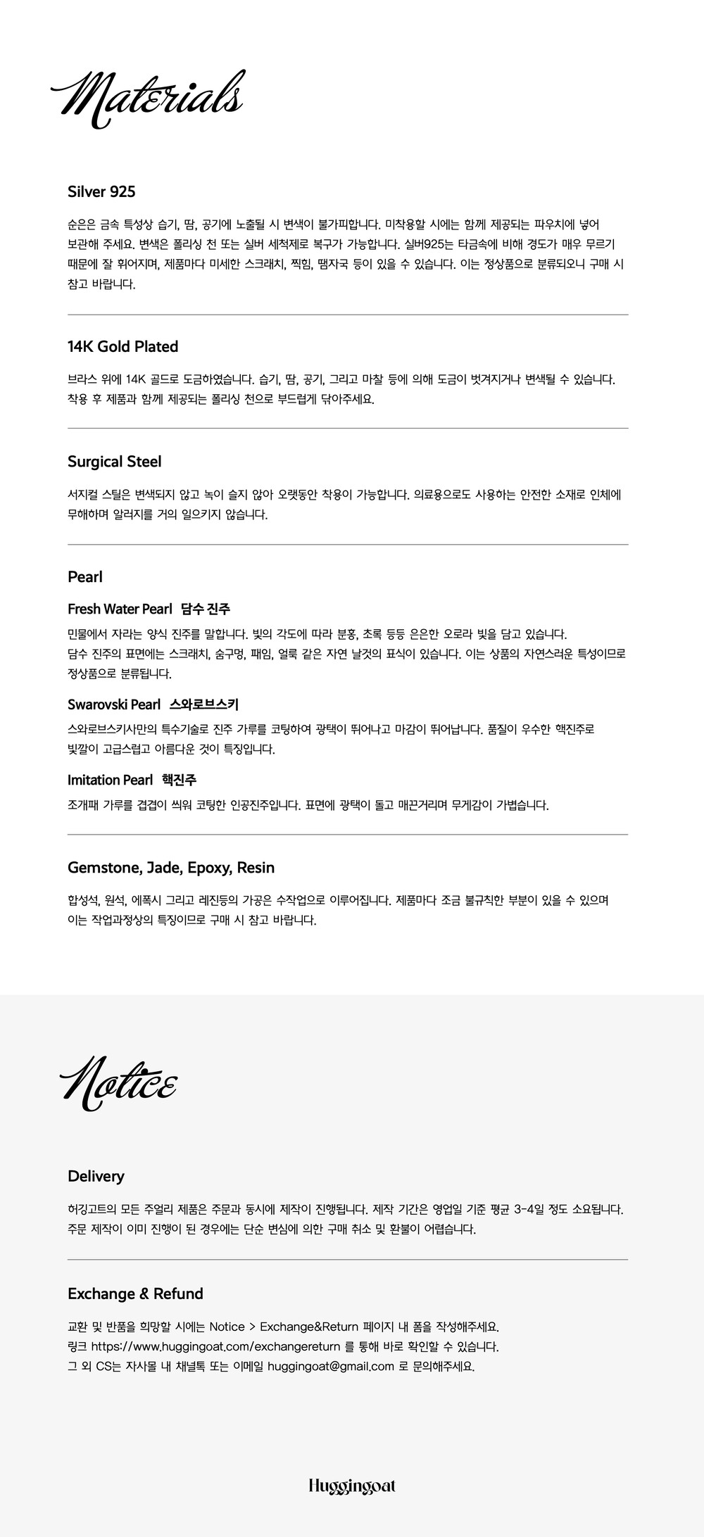 허깅고트의 주얼리 라인은 오더 메이드 시스템으로 제작됩니다. 주문결제 후 제작일은 영업일 기준 1-2일, 배송은 별도로 영업일 기준 2-4일 소요됩니다. 결제 후 단순변심에 의한 교환 및 환불이 어려우니 신중한 선택 부탁드립니다. 배송 도중 훼손의 경우 동일제품으로 교환해드립니다.