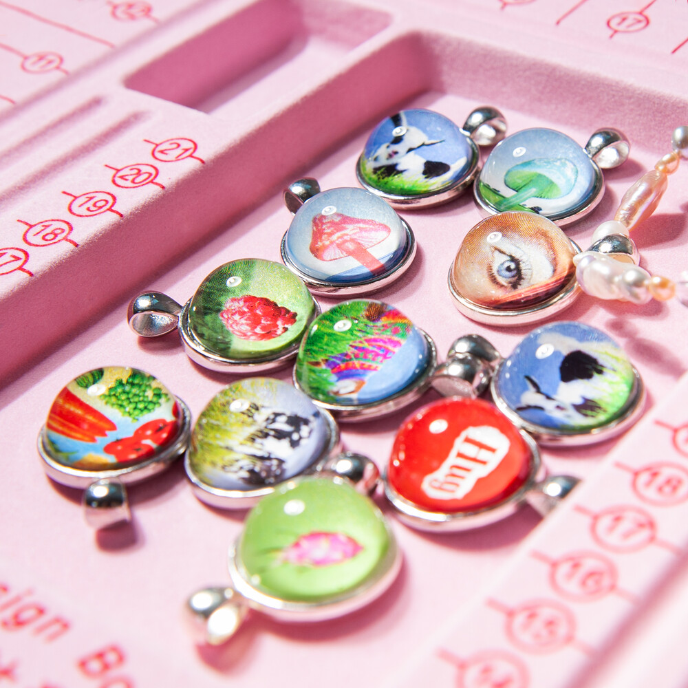 판타지스럽고 키치함을 더하는 무지개 니트 염소 팬던트가 포인트입니다.