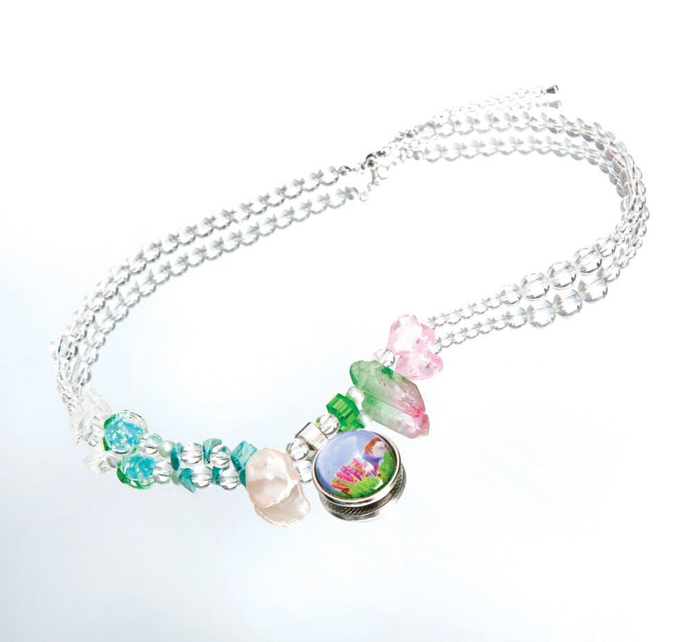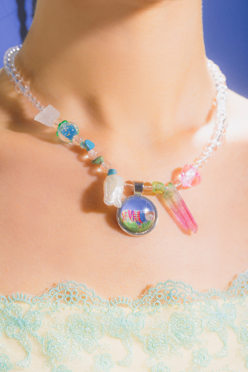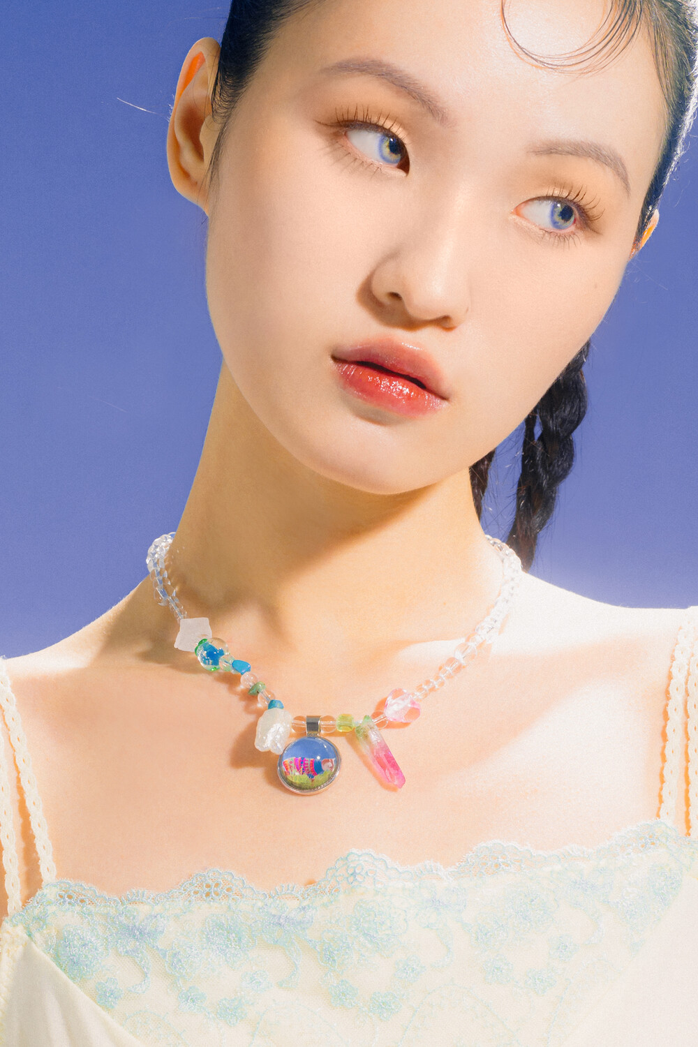 다양한 자재(진주, 원석, 자체 제작 팬던트 etc.) 들을 불규칙적으로 구성하여 자유분방한 분위기를 강조하였습니다.
