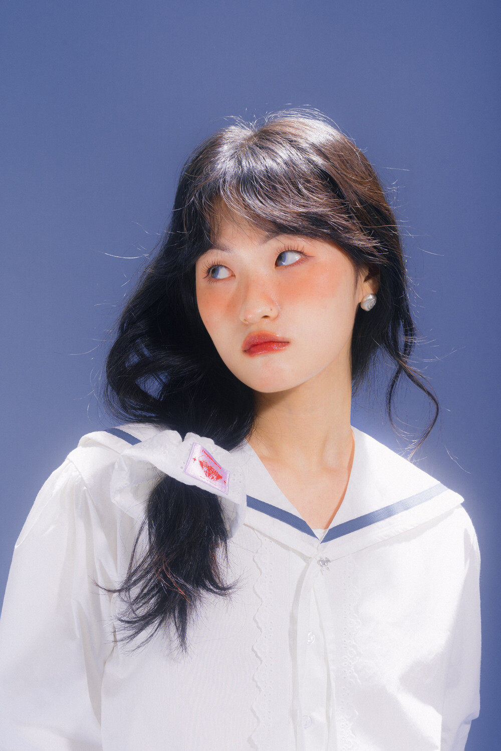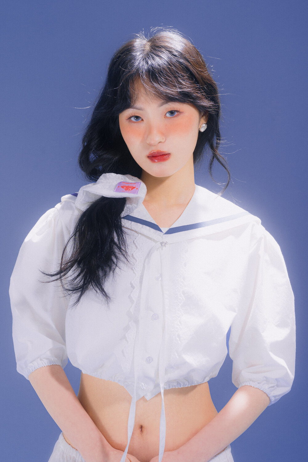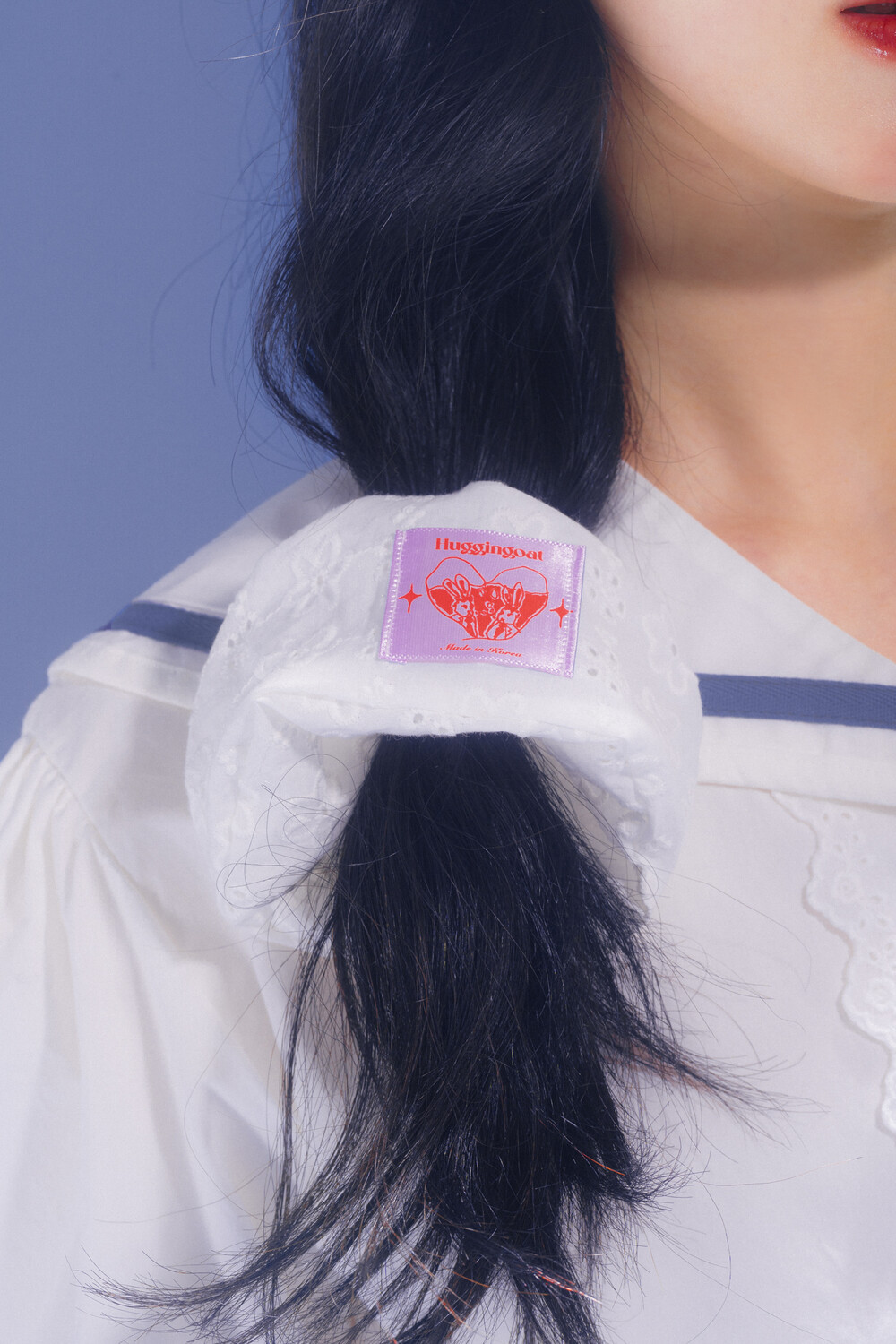 플라워 펀칭 코튼 원단, 사다리꼴 모양의 핏감, 허깅고트 라벨.