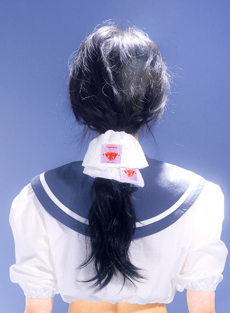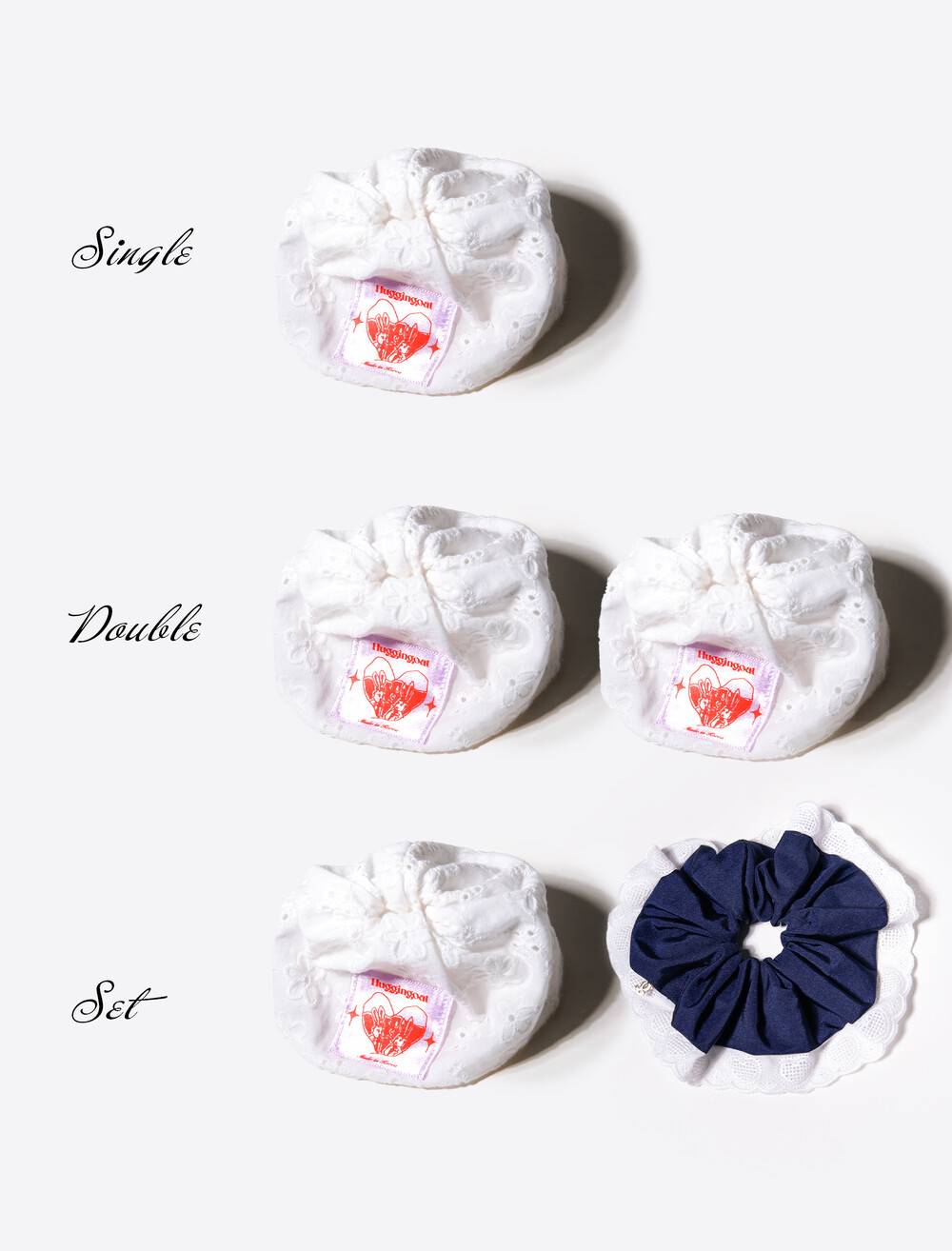 사다리꼴 모양의 패턴을 자체 개발하여 제작한 상품입니다. 꽃 형태의 펀칭 원단을 사용해 디테일을 더했습니다. 모델 착용 사진처럼 두 개를 교차해 착용하시면 더욱 풍성하게 스타일링 하실 수 있습니다.