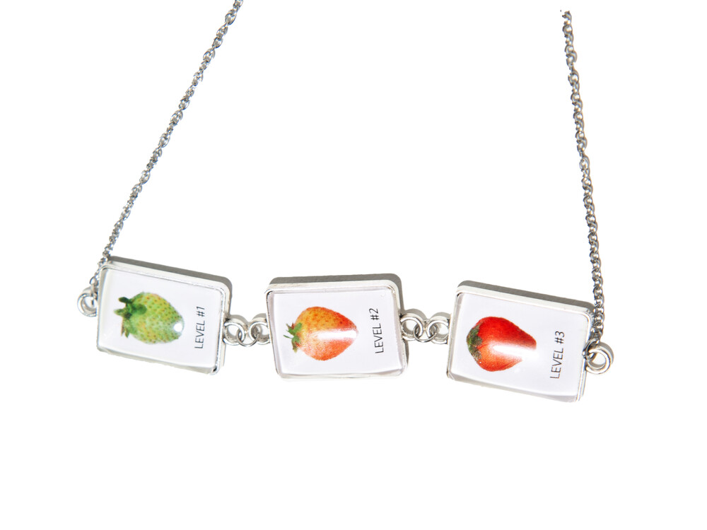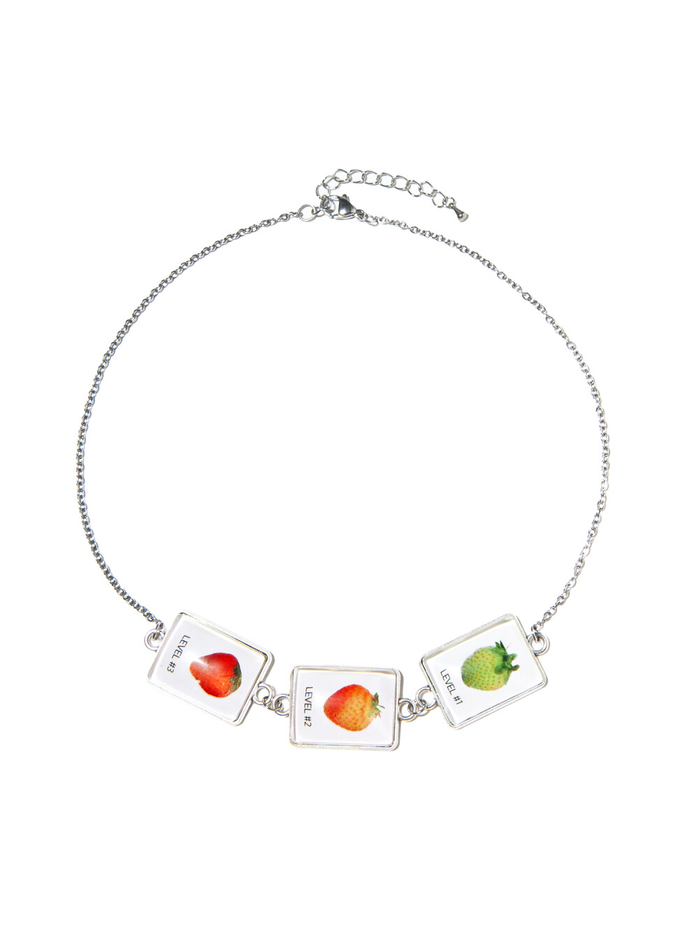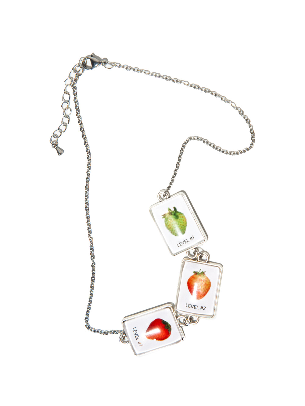 DESCRIPTION CYCLE 시리즈는 시간의 흐름 그리고 순환을 보여주는 연속 이미지를 사용하여 디자인 되었습니다. 과일이 예쁘게 익는 과정, 시계가 도는 과정 등등 시간의 흐름을 보여주는 이미지들이 시각화되었습니다. CYCLE #001은 딸기가 익는 과정을 담은 초커 네크리스입니다.