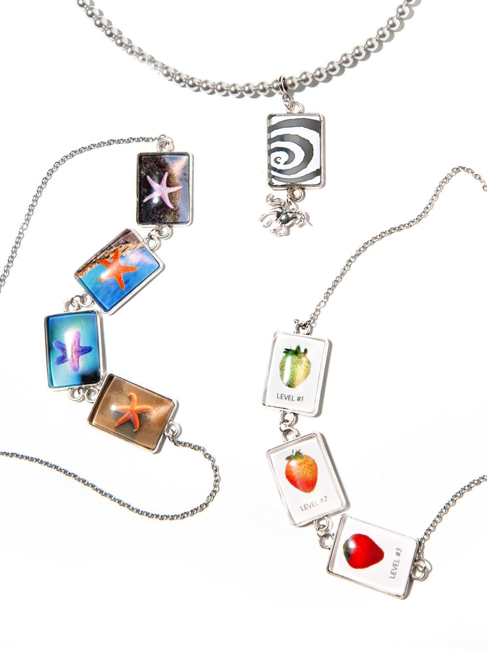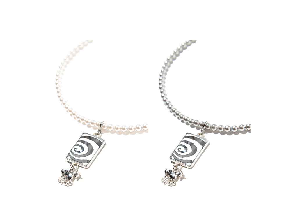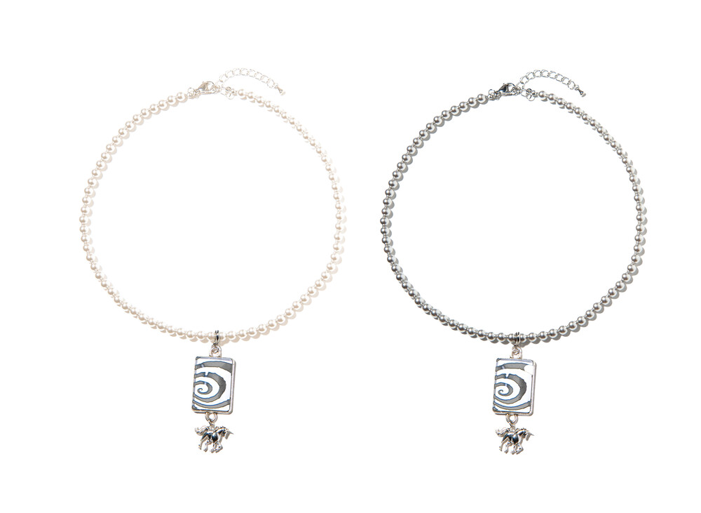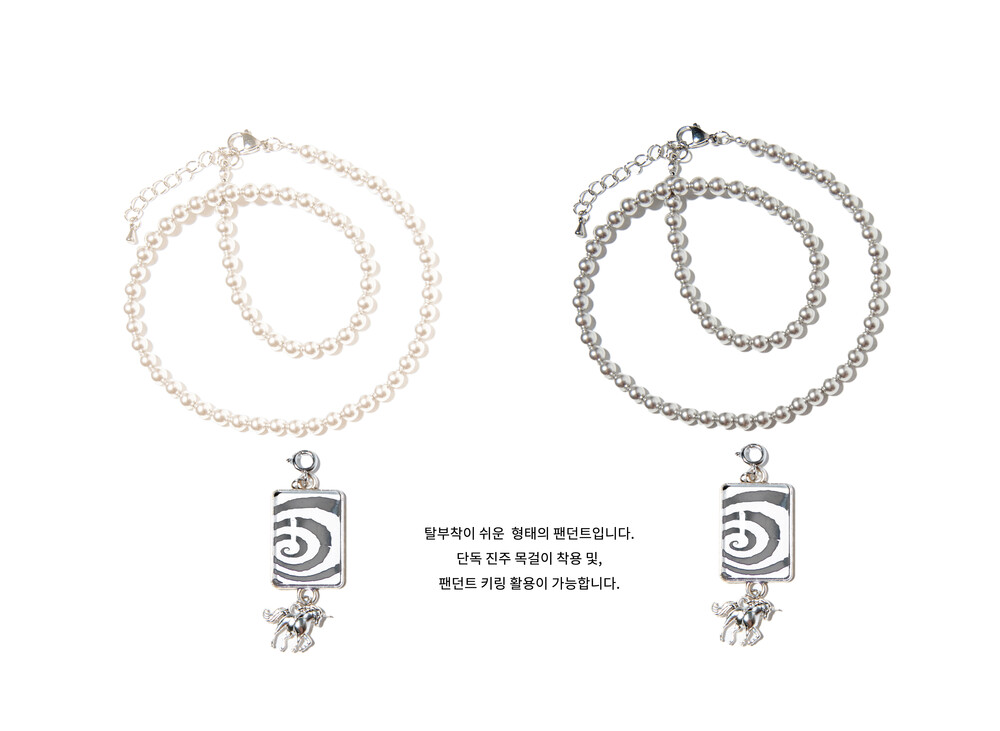 Swirl 패턴의 팬던트와 유니콘 팬던트로 포인트를 주었습니다. 톤앤톤 회색 진주와, 깨끗한 느낌의 미색 진주로 옵션을 선택할 수 있습니다. 팬던트는 쉬운 탈부착 형태로 다양한 코디가 가능합니다.