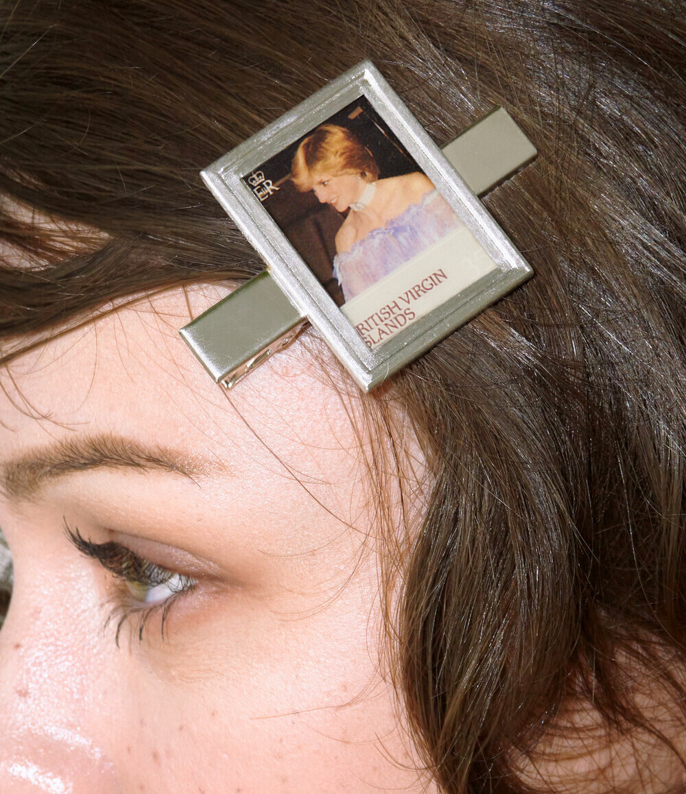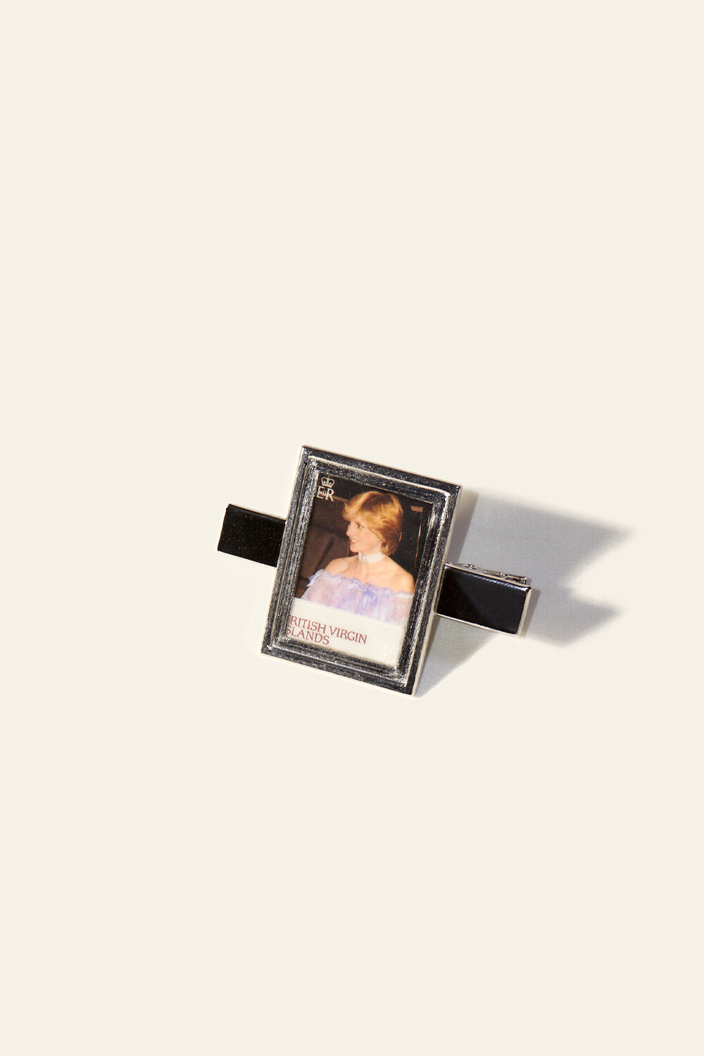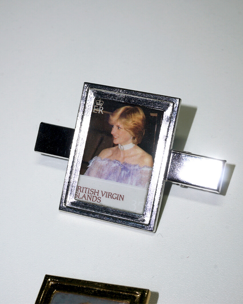 창문과 커튼을 형상화한 프레임 헤어핀입니다. 표면에는 자글자글한 텍스쳐로 빈티지 나무 창문 같은 묘사를 더했습니다. 실제 빈티지 우표를 활용한 희소성 있는 Limited 제품입니다.