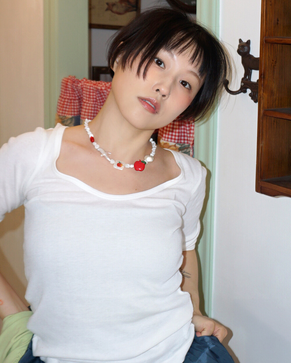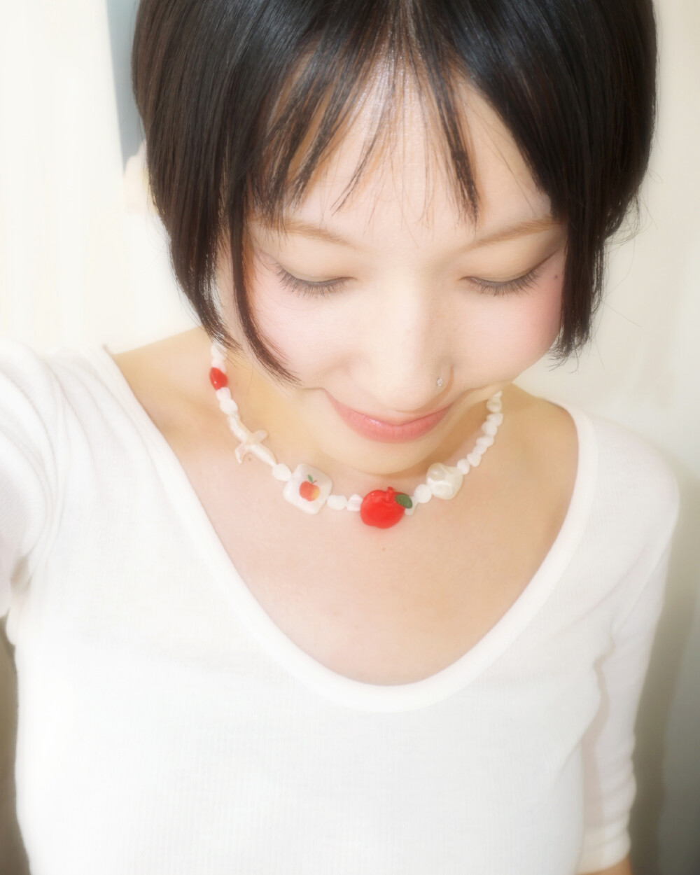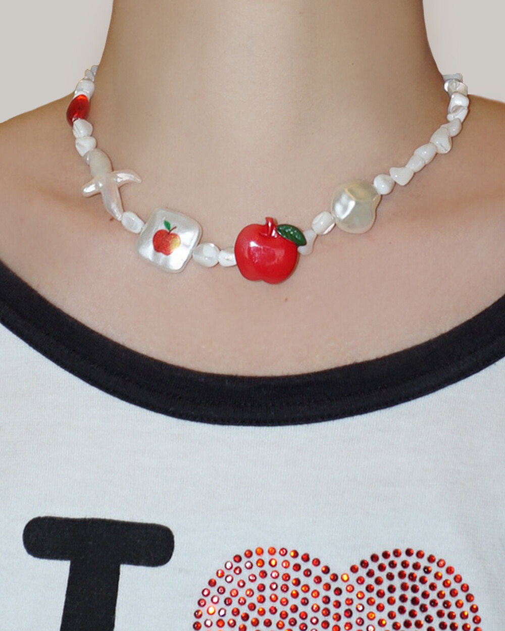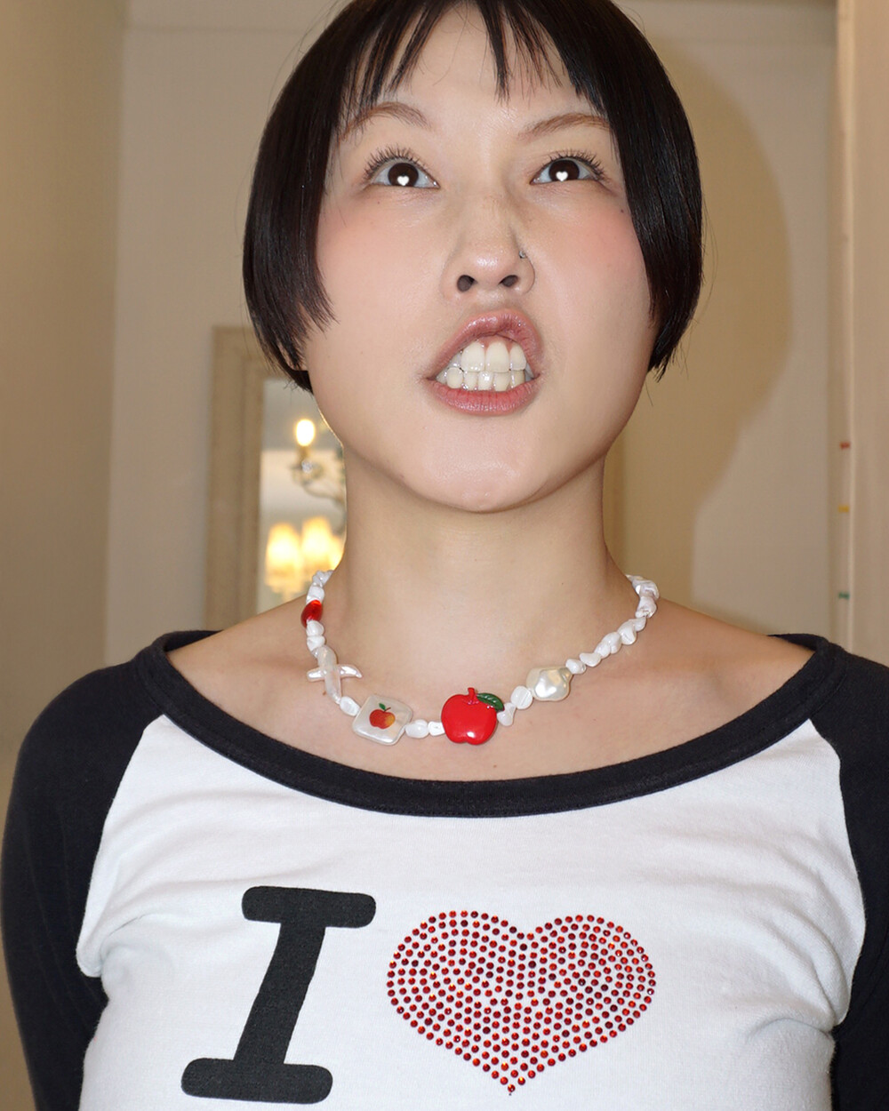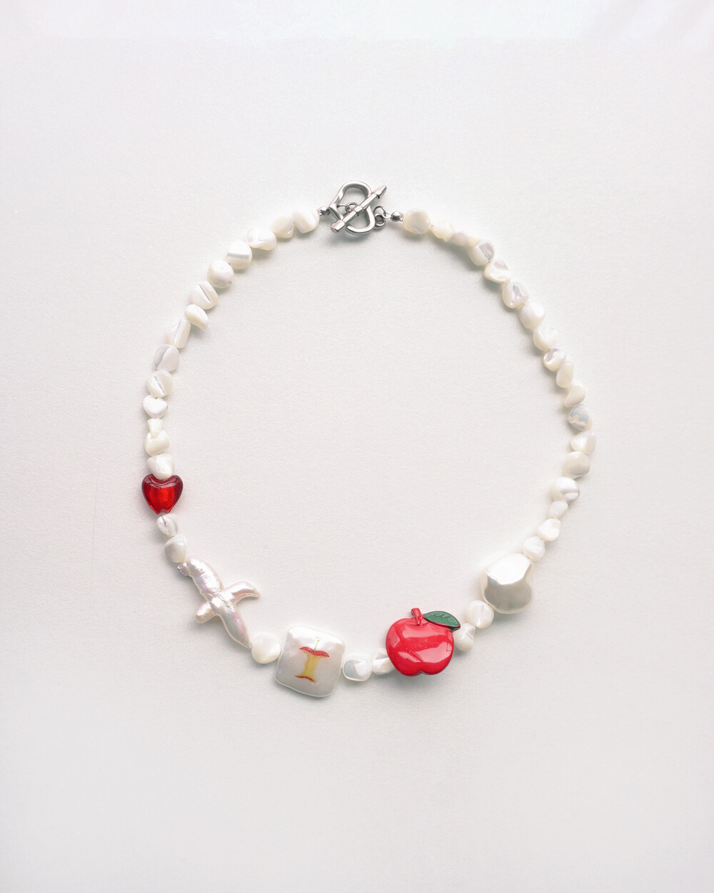 우윳빛의 자개 비즈로 맑은 느낌을 더했으며, 사각 진주의 두 면에는 서로 다른 사과 이미지를 넣어 위트를 더했습니다. 비비드한 사과 팬던트와 램프 워크로 제작된 유리 하트 비즈가 조화를 이룹니다.