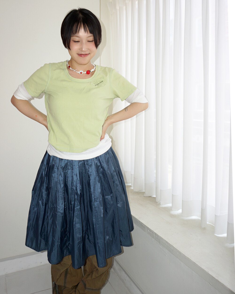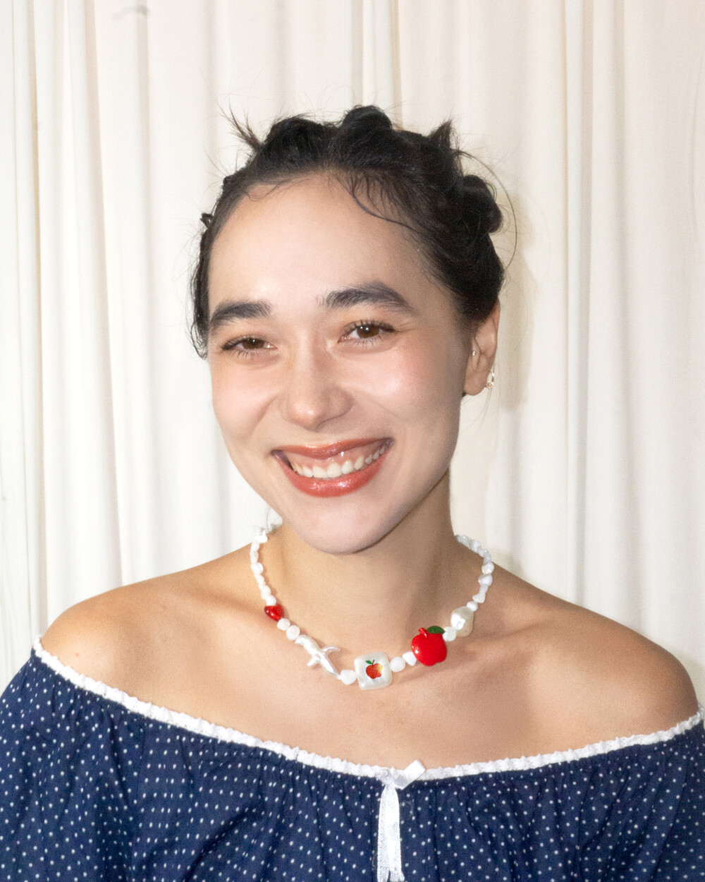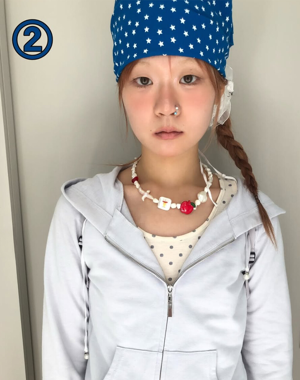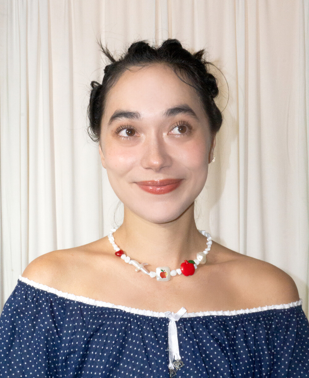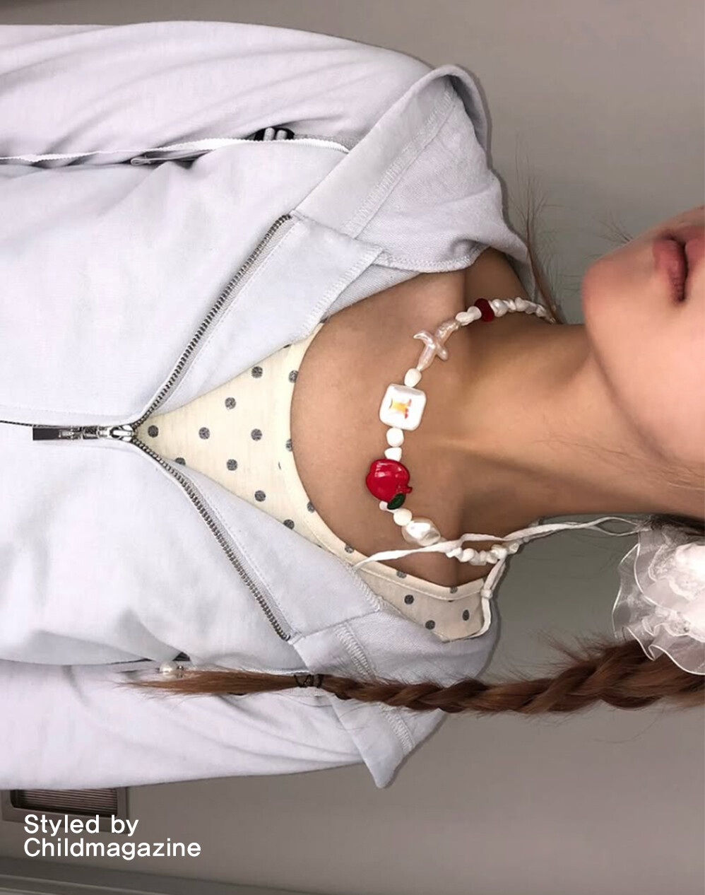 우윳빛의 자개 비즈로 맑은 느낌을 더했으며, 사각 진주의 두 면에는 서로 다른 사과 이미지를 넣어 위트를 더했습니다. 비비드한 사과 팬던트와 램프 워크로 제작된 유리 하트 비즈가 조화를 이룹니다.