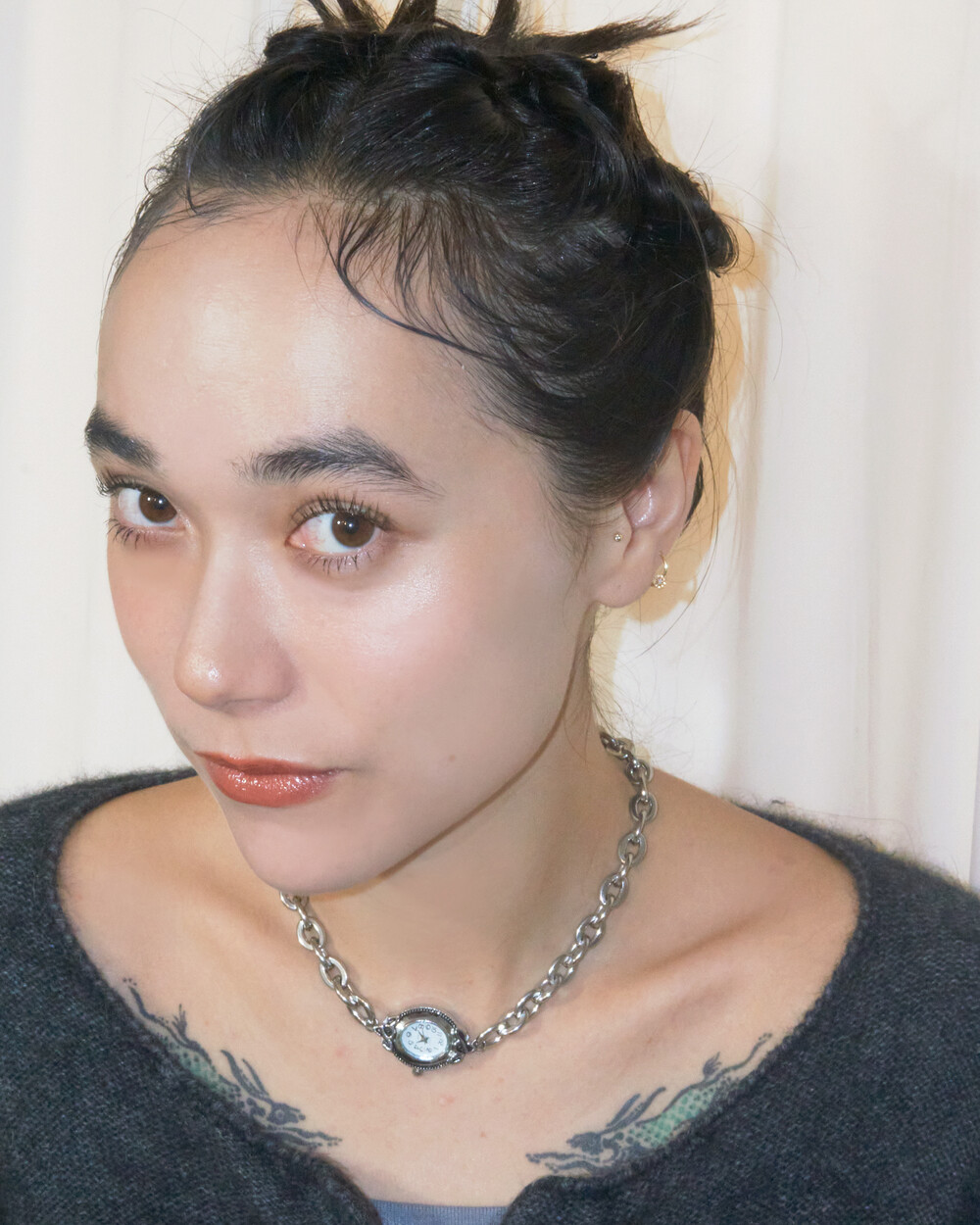 실제 시계 팬던트를 활용한 재미있는 네크리스 디자인입니다. 뒷 마감 장식에는 귀여운 별모양 진주가 있습니다.
