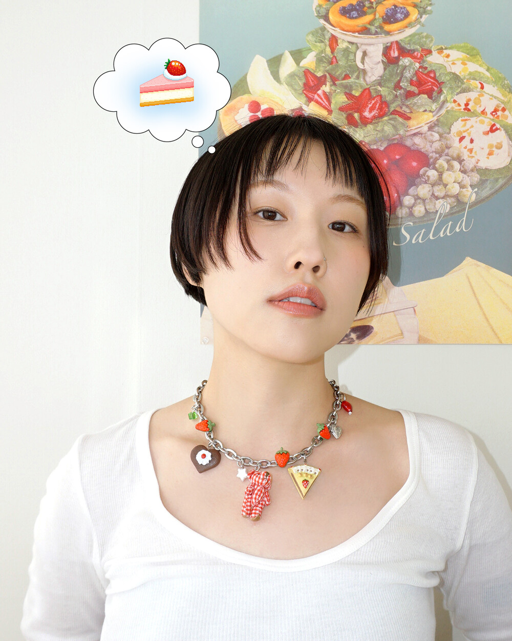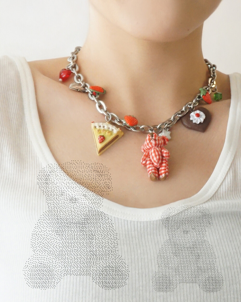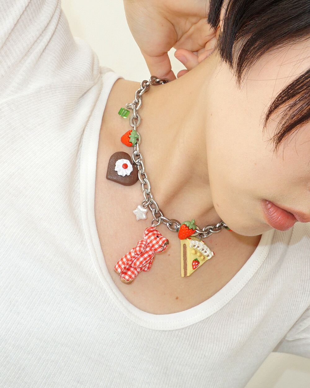디저트 모형, 깅엄 체크 테디베어 인형, 장난감 딸기 팬던트, 별 진주, 미니 로켓 등 다채로운 장식들이 알록달록 매달려 있어요. 볼드한 서지컬 체인이 키치한 무드를 살짝 눌러주었어요,