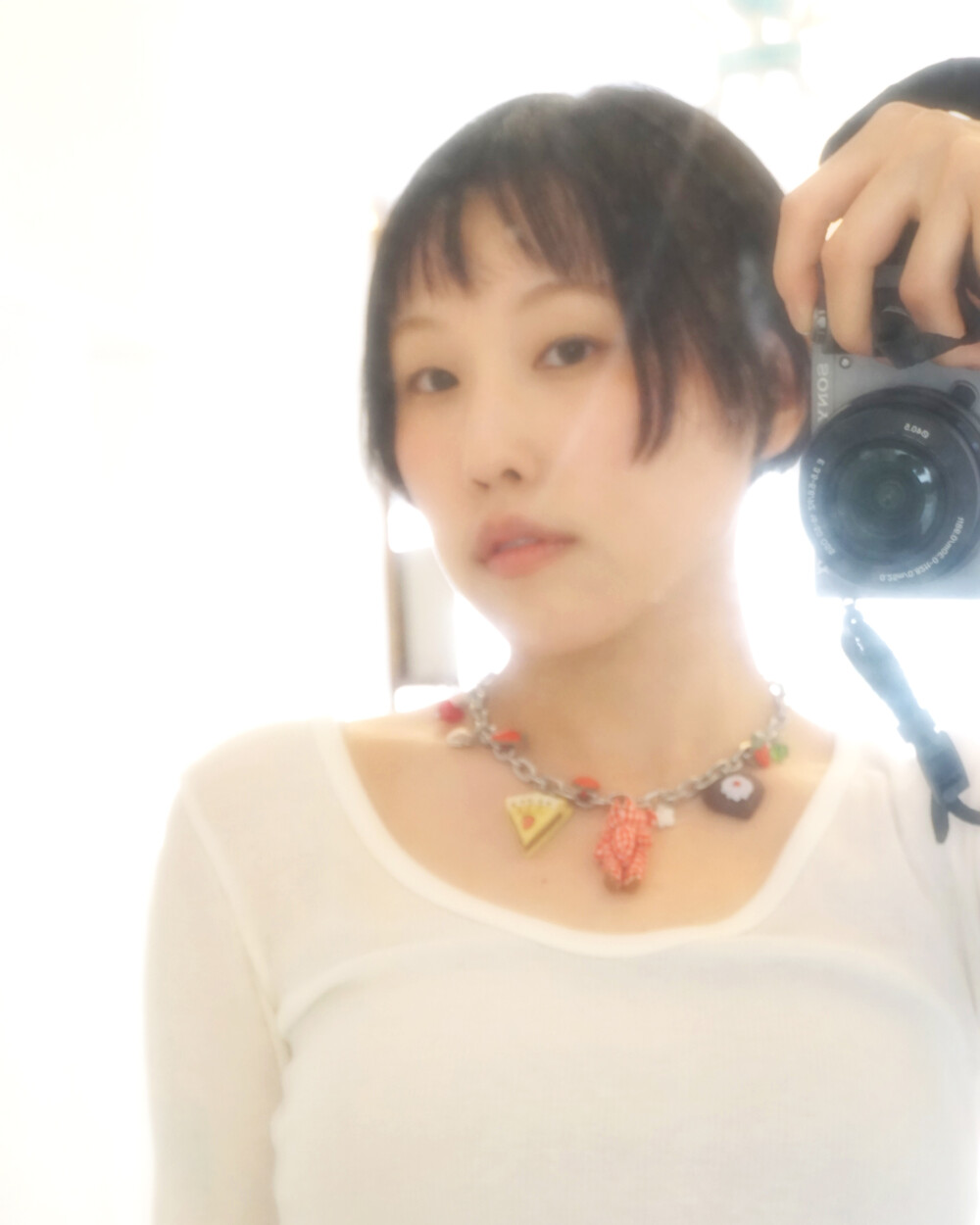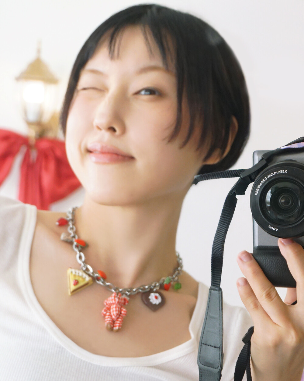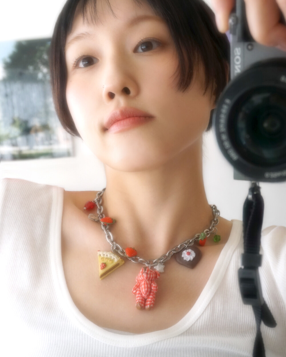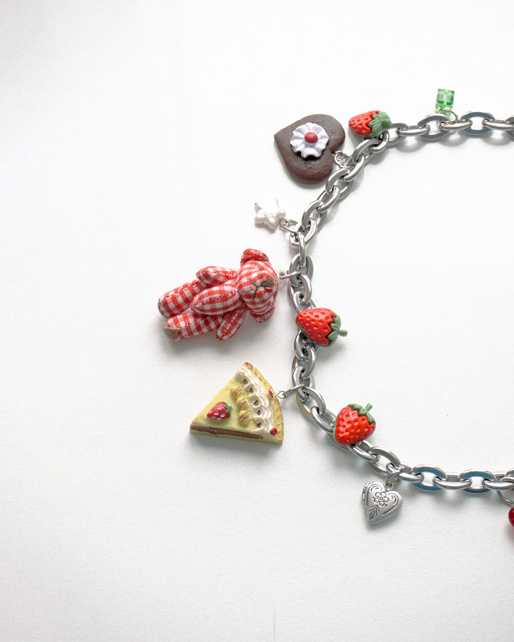 디저트 모형, 깅엄 체크 테디베어 인형, 장난감 딸기 팬던트, 별 진주, 미니 로켓 등 다채로운 장식들이 알록달록 매달려 있어요. 볼드한 서지컬 체인이 키치한 무드를 살짝 눌러주었어요,