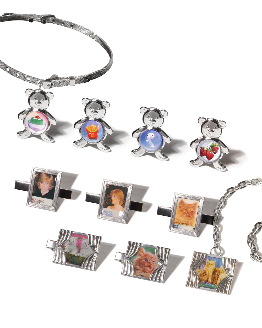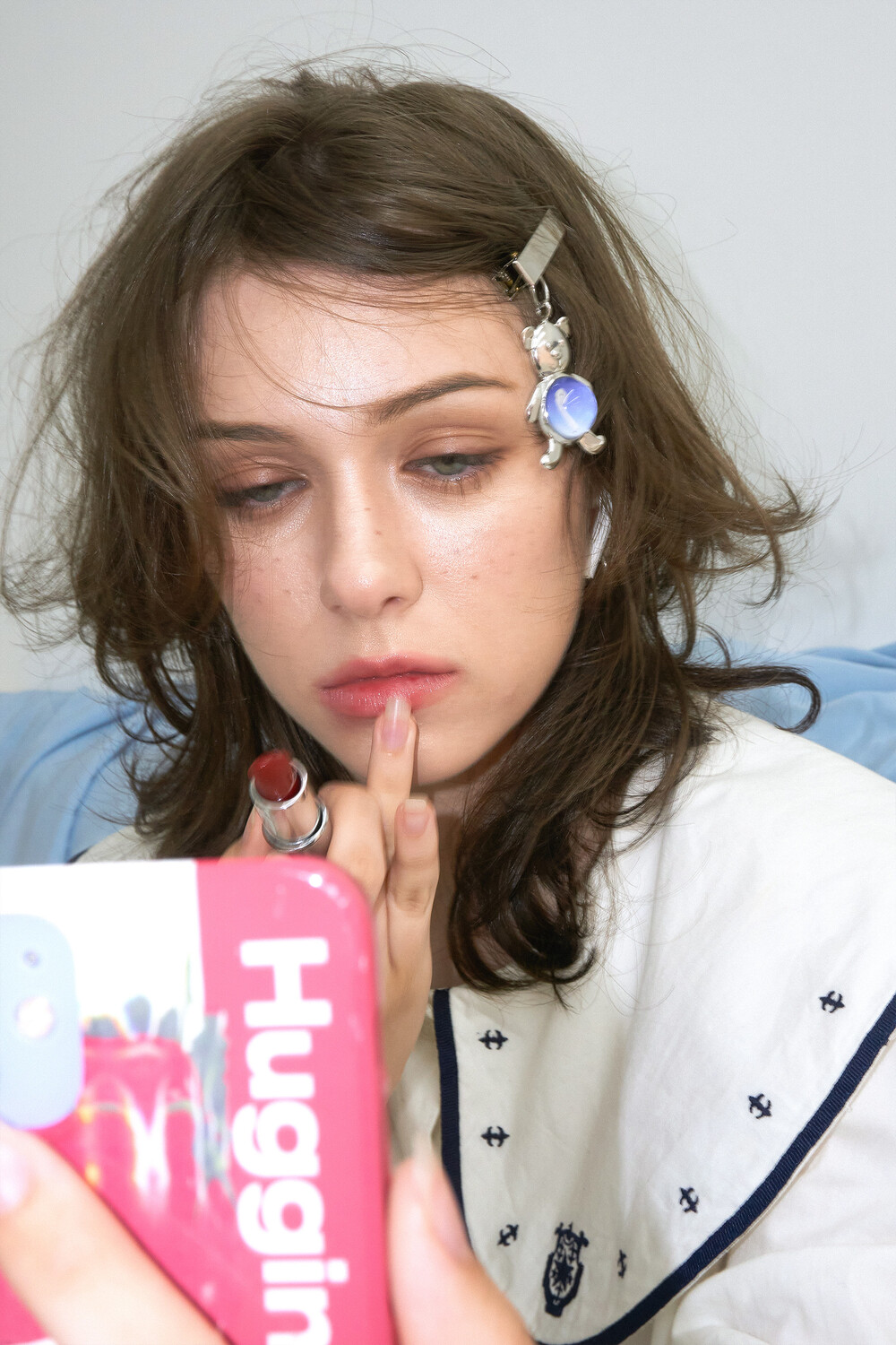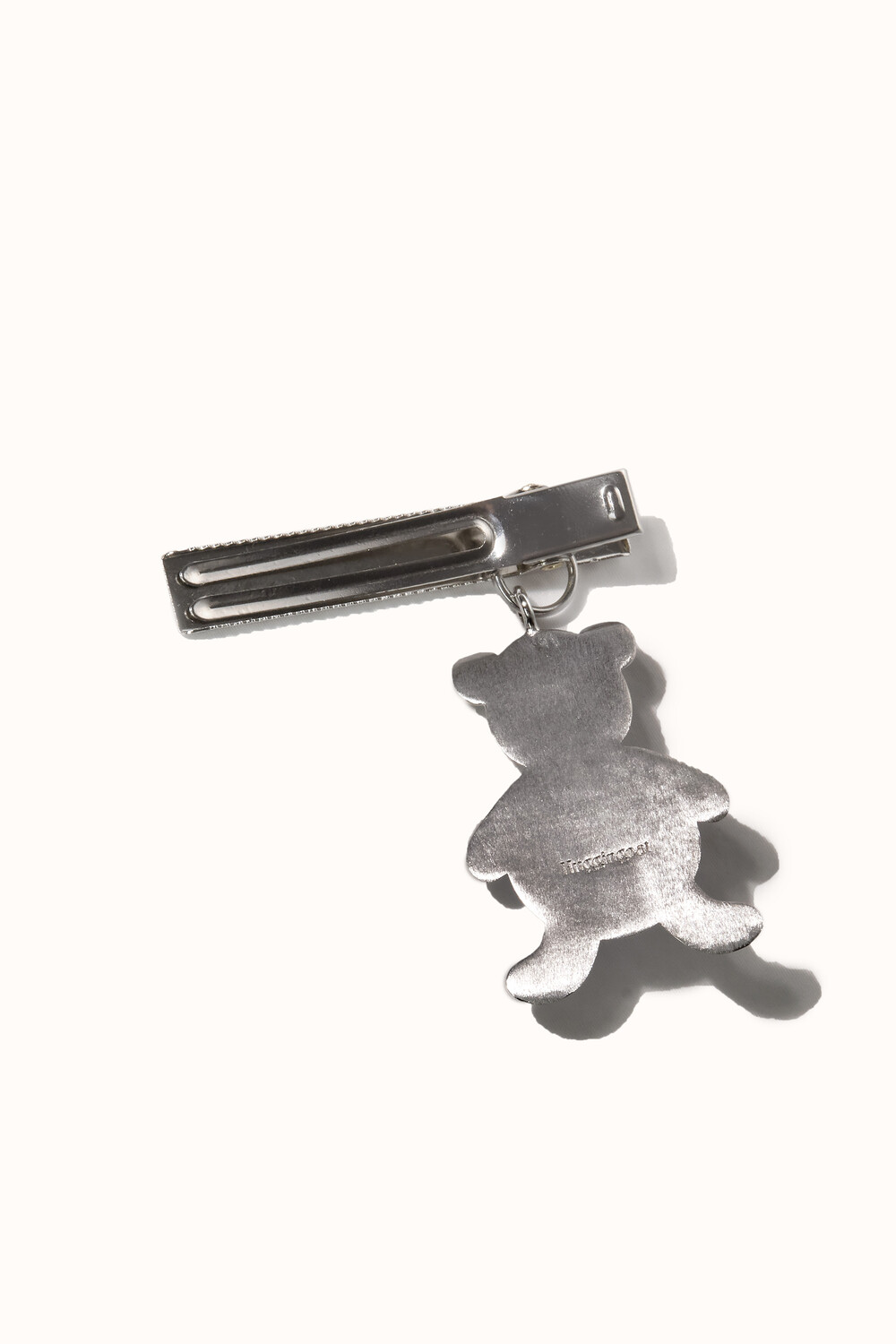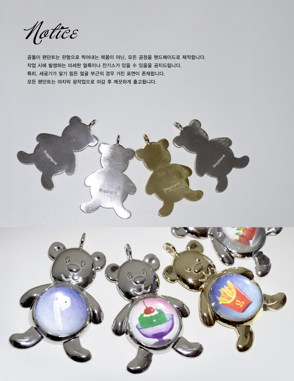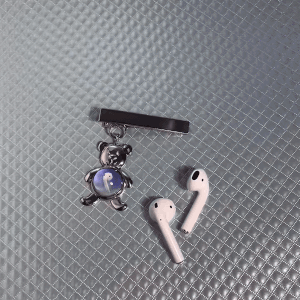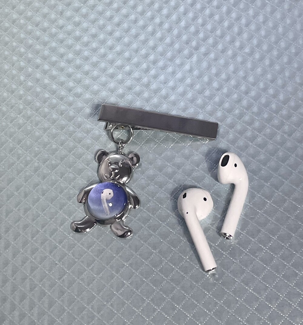 허깅고트 시그니처 테디베어 팬던트가 달린 헤어핀입니다. 실제 에어팟과 함께 착용하면 색다른 룩을 완성할 수 있습니다.